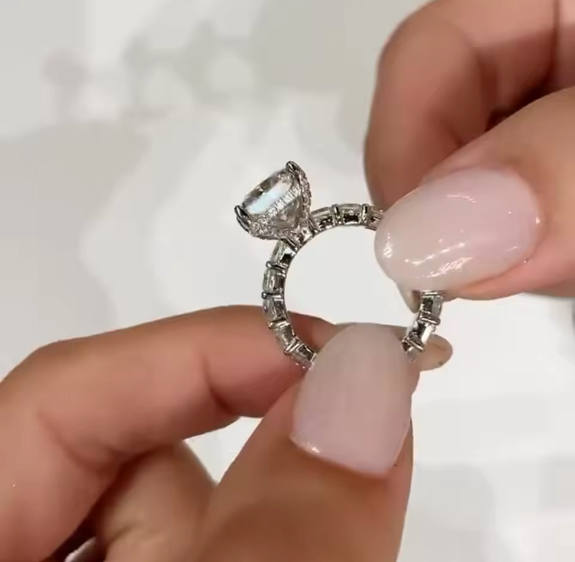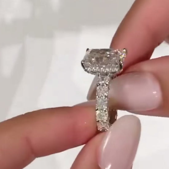 Designed with exceptional precision and brilliance, the 4.5 carat radiant Moissanite ring features individual surrounding stones the entire way around the band . Elevate your style with this sophisticated and essential piece.