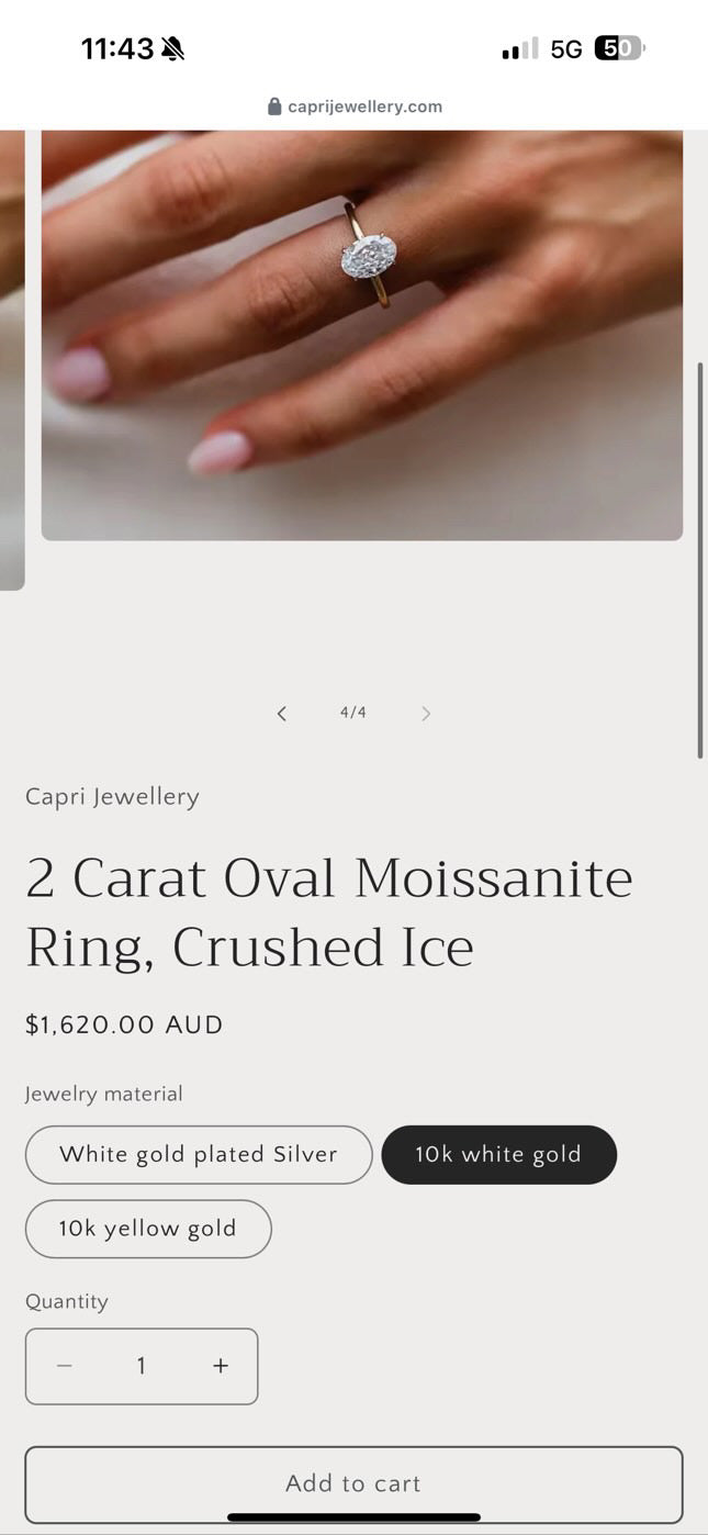 2 Carat Oval Moissanite Ring, Crushed Ice