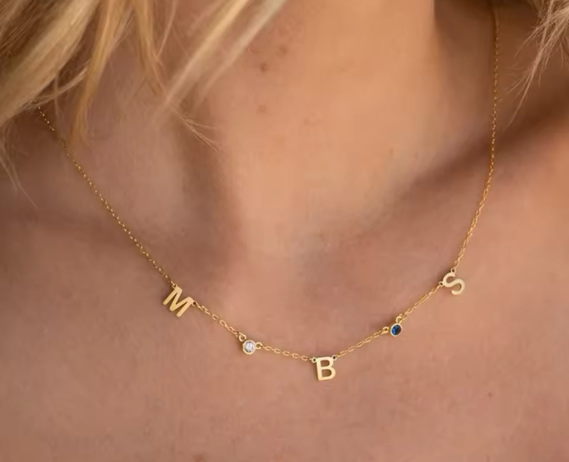 Enhance your style with a personalised touch by wearing our custom letter necklace, featuring 3 letters & your choice of birthstone